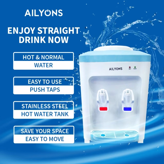 The Ailyons AFK-103 Hot & Normal Tabletop Water Dispenser is a compact and practical appliance designed for homes, offices, and small spaces where convenience and efficiency matter. It offers both hot water for tea, coffee, or instant meals ☕🍜 and normal room-temperature water 💧, making it versatile for daily hydration needs. Its tabletop design saves space while providing easy access, and the dispenser is built with durable materials to ensure long-lasting performance.