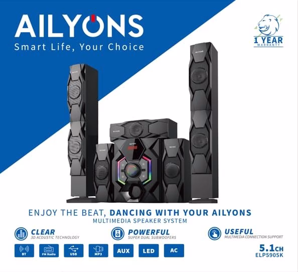 The Ailyons ELP5901K 5.1ch Home Theater System 🔊 is a powerful audio setup designed to transform your living room into a mini cinema. With its 5.1 channel configuration (five satellite speakers + one subwoofer), it delivers immersive surround sound, making movies, music, and gaming experiences more engaging.