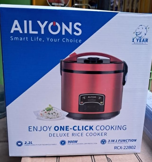 he Ailyons RCX-22B02 2.2L 3-In-1 Deluxe Rice Cooker is a versatile kitchen appliance designed to simplify meal preparation by combining cooking, steaming, and warming functions in one compact unit. With its 2.2-litre capacity, it’s ideal for small to medium households, offering enough space to prepare rice, soups, or steamed vegetables. The cooker features a nonstick inner pot for easy cleaning, a durable heating element for consistent cooking, and a keep-warm function that maintains food at the right temperature until serving. Its sleek design and sturdy build make it both practical and stylish for modern kitchens.