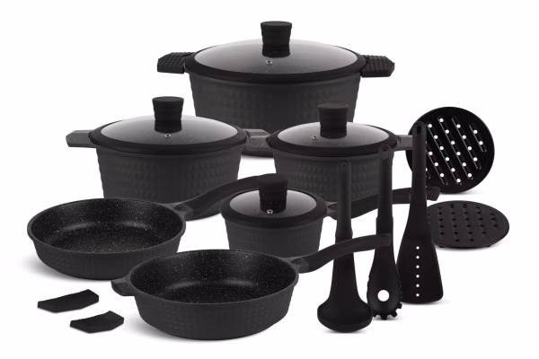 The Edenberg EB5645 is a comprehensive 15-piece cookware set that caters to a variety of cooking needs. Crafted from high-quality forged aluminum, this set is known for its durability and efficient heat distribution, ensuring that food cooks evenly. The set typically includes pots and pans in various sizes, complete with lids, and sometimes comes with additional kitchen tools. The non-stick marble coating is a standout feature, promoting healthier cooking by reducing the need for excessive oil. Moreover, the elegant gold finish adds a touch of luxury to the kitchen. Suitable for various types of stovetops, including induction, the Edenberg EB5645 set combines functionality with style, making it a popular choice for those looking to upgrade their kitchenware.