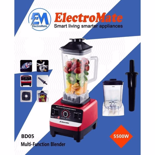 The Electromate BD05 2L Commercial Blender is a powerful and versatile appliance designed for both home and professional use. With a generous 2-liter capacity and a high-speed motor rated up to 5500W, it effortlessly blends fruits, vegetables, ice, and dry ingredients like nuts or coffee beans. Its durable stainless steel blades and sturdy plastic jar ensure long-lasting performance, while the dual-speed control and pulse function offer flexibility for different textures and recipes. Safety features like overheat protection and a non-slip base make it reliable for daily use. This blender is a favorite for juice bars, smoothie stations, and home kitchens, often bundled with grinder jars and accessories to enhance its functionality.