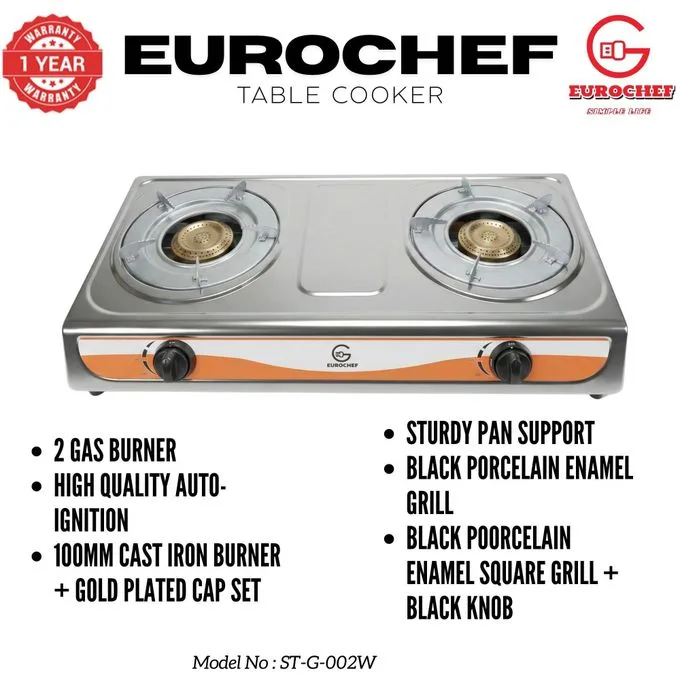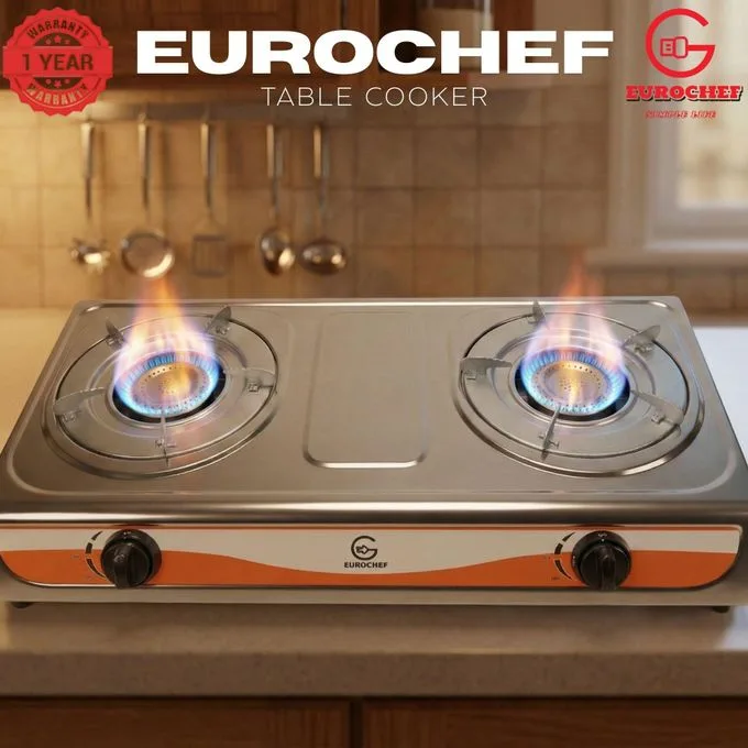 The Eurochef 2-Burner Stainless Steel Tabletop Gas Cooker is a practical and stylish solution for modern kitchens, hostels, and outdoor setups. Designed with two high-performance burners, it allows you to prepare multiple dishes simultaneously with consistent heat and energy efficiency. The durable stainless steel top not only adds a sleek finish but also makes cleaning quick and easy, while the compact tabletop design ensures it fits perfectly in limited spaces. With its auto-ignition system, sturdy pot supports, and lightweight portability, this cooker combines convenience, reliability, and efficiency—making it an essential appliance for everyday cooking.