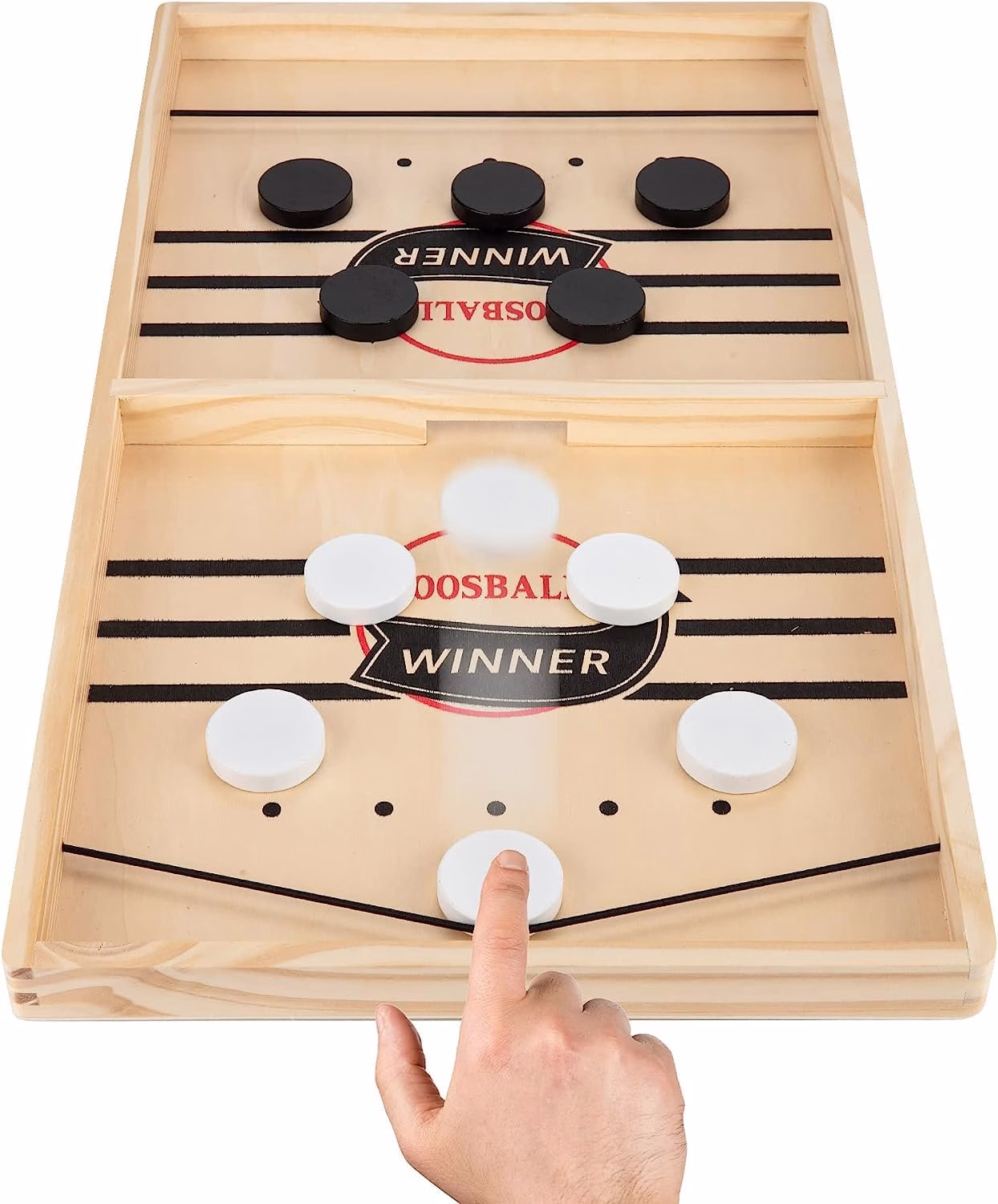 The FoosBall Winner Board Game 🎯 is a lively tabletop challenge that brings fast-paced fun to family gatherings and game nights. Often referred to as the sling puck game, it features a sturdy wooden board divided into two halves, with players using elastic bands to sling pucks through a central gate. The goal is simple yet thrilling—clear all the pucks from your side before your opponent does. Its compact design makes it easy to carry and store, while the durable build ensures long-lasting play