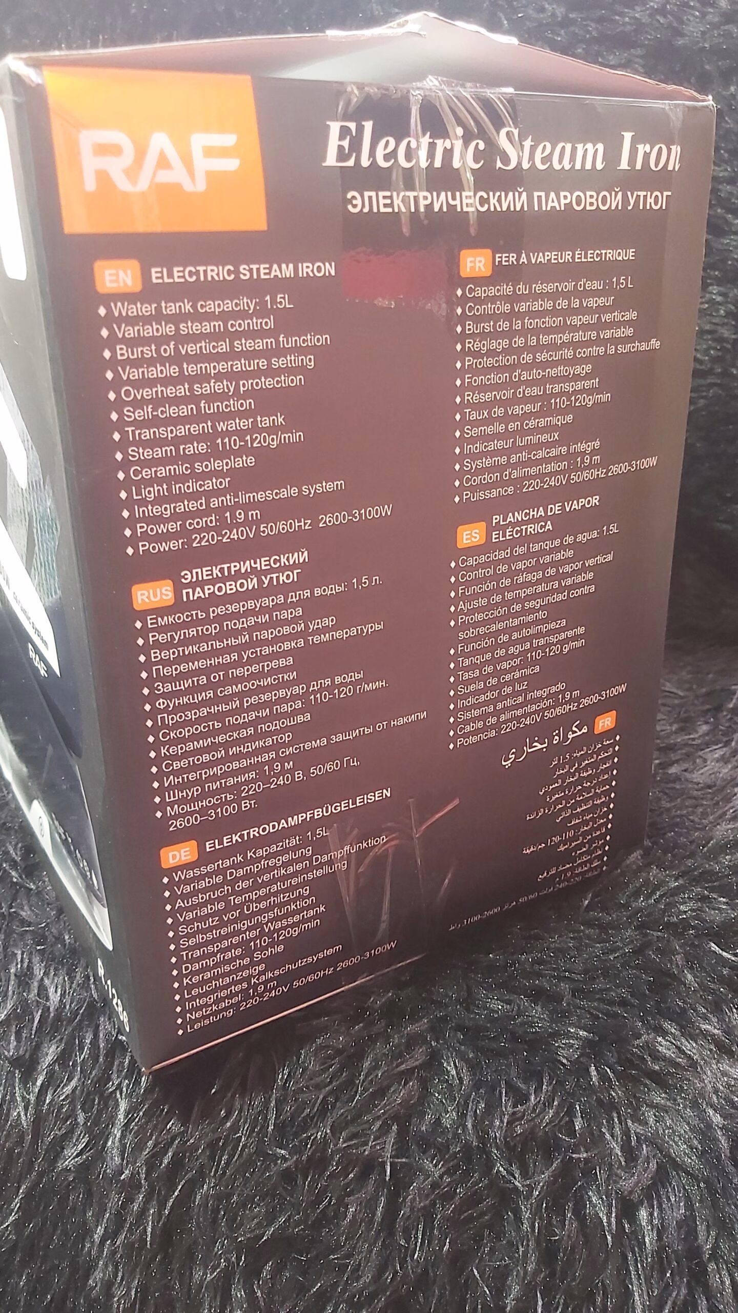 The RAF R.1286 Electric Steam Iron is an excellent addition to any household, offering both efficiency and convenience. With its powerful performance ranging from 2600 to 3100 watts, it ensures quick and effective ironing, making even the most stubborn wrinkles disappear. The iron features a large 1500mL polypropylene (PP) water tank that provides ample steam for extended ironing sessions, while the ceramic soleplate ensures smooth gliding over fabrics and prevents any sticking. Additionally, the self-cleaning function helps maintain the iron’s performance and longevity, reducing the need for frequent maintenance. Ergonomically designed for comfort, the RAF R.1286 Electric Steam Iron is easy to use and makes ironing less of a chore. Safety is also a priority with its anti-leakage system and auto-shutoff feature, giving you peace of mind during use. This steam iron is a must-have for anyone looking to simplify their ironing tasks and achieve professional results at home.