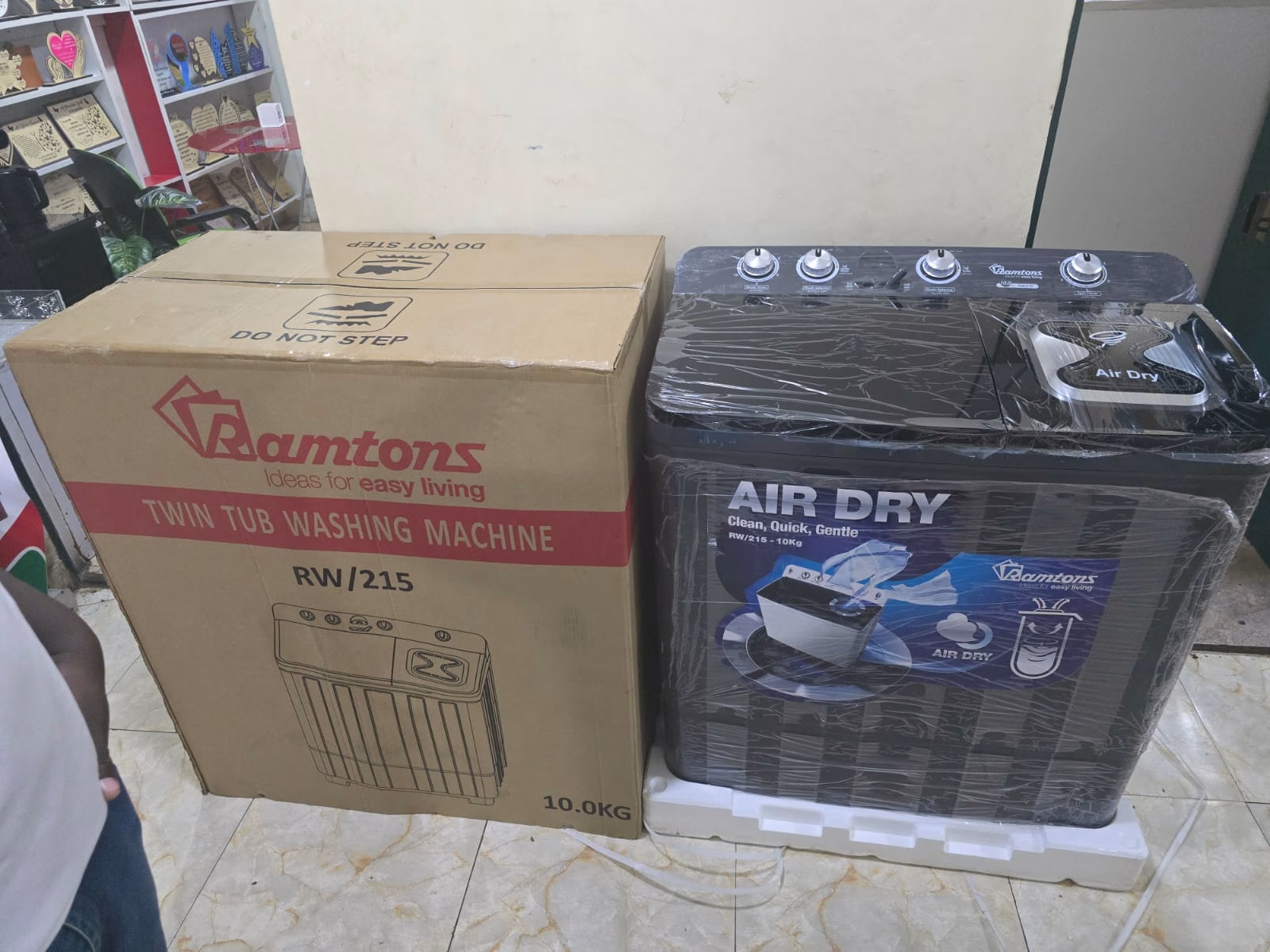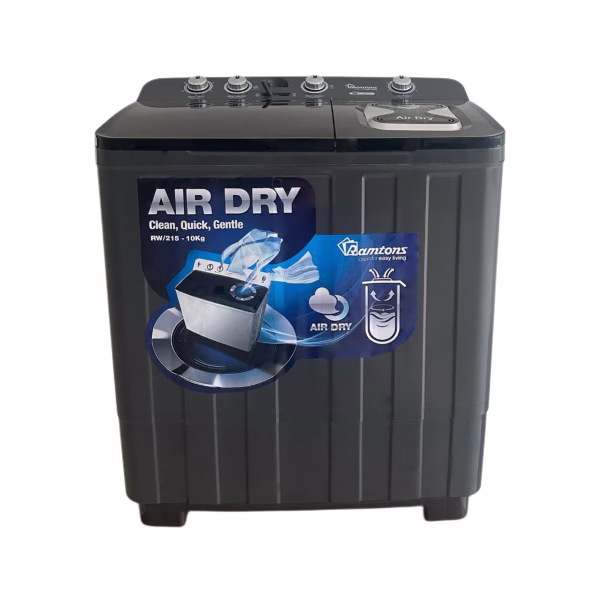 The Ramtons RW/215 🧺 is a 10Kg twin-tub semi-automatic washing machine designed for households that need a balance of power, efficiency, and affordability. With a generous 10Kg washing capacity 🧼 and a 6Kg spin capacity 🔄, it’s ideal for medium to large families. Its air dry technology 🌬️ helps reduce drying time by spinning clothes without heat, achieving up to 80% drying efficiency. The machine features manual controls 🕹️ for wash and spin timers, along with a normal/heavy load selector for customized cleaning. It includes a gravity drain system 💧 and a lint filter 🧽 for easy maintenance, plus a rat-proof base 🐀 for added durability. Built with a sturdy plastic body and transparent lids 🧱, it’s available in black and white ⚫ depending on the retailer. The RW/215 is semi-automatic 🔌, meaning users manually add water and drain it, making it water-efficient and suitable for areas with limited plumbing.
