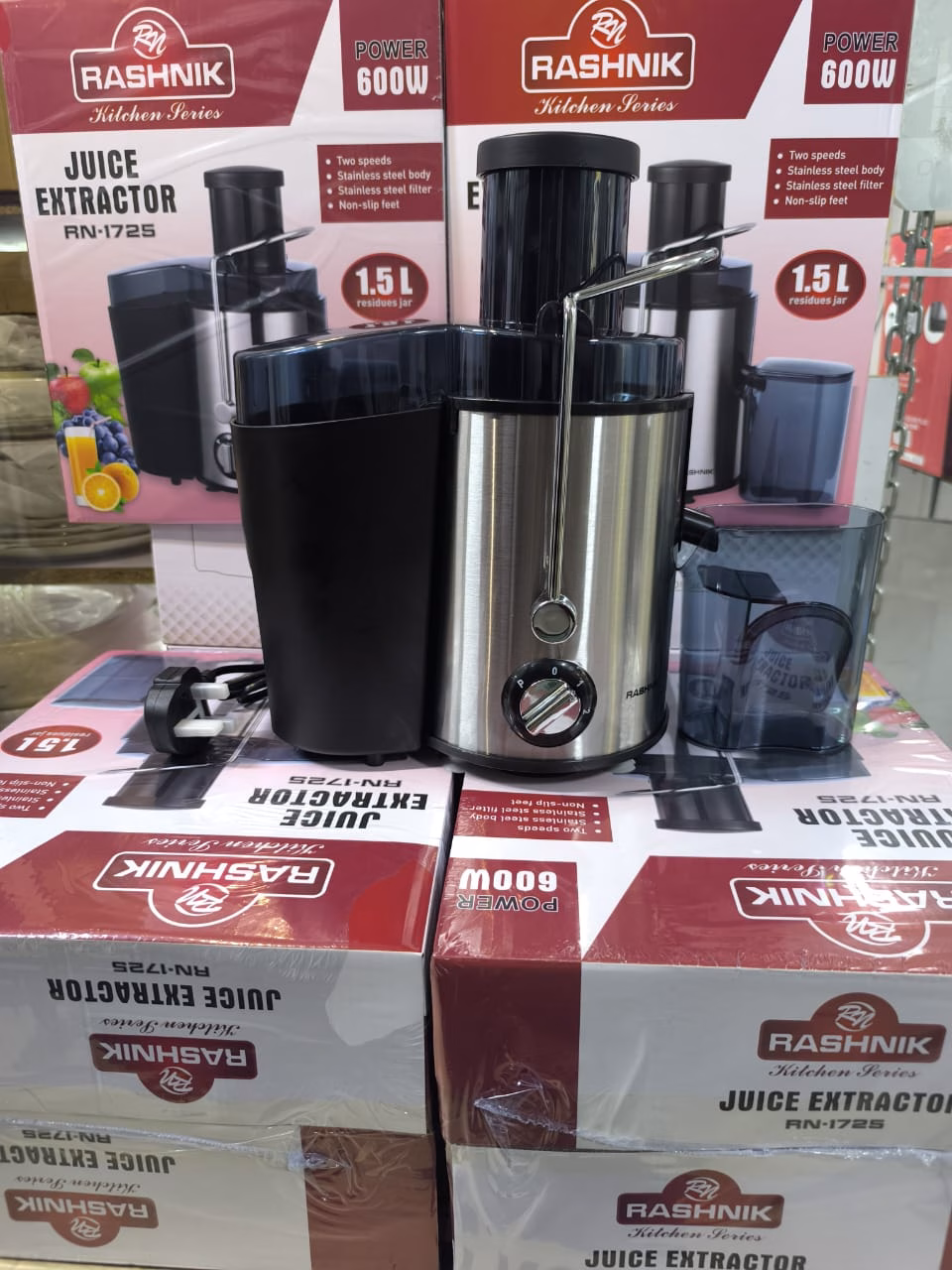The Rashnik RN-1725 Juice Extractor is a powerful and stylish kitchen appliance designed to make fresh juice quickly and efficiently. Built with a durable stainless steel body and equipped with a 600W motor, it delivers strong performance while maintaining ease of use. Its 1.5-liter capacity allows you to prepare juice for the whole family, and the dual-speed settings give flexibility to handle both soft fruits like oranges and harder ones like carrots or apples. Safety features such as non-slip feet ensure stability during operation, while the detachable parts make cleaning simple and convenient. Compact yet robust, the RN-1725 is a practical choice for anyone looking to enjoy healthy, homemade juice every day.