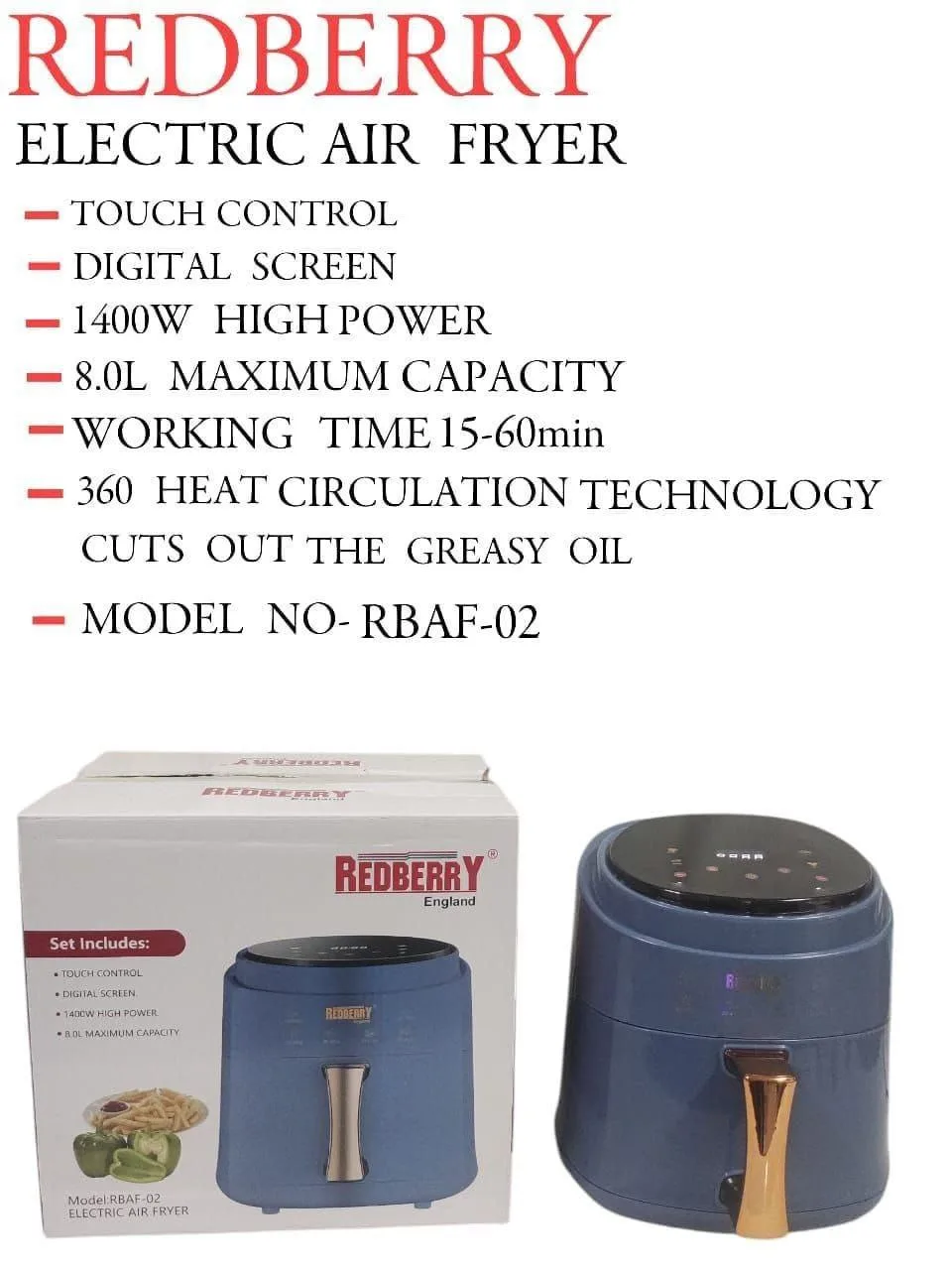 Cook smarter, healthier, and bigger with the Redberry RBAF-02 8L Air Fryer. Engineered with advanced rapid air circulation technology, it delivers crispy, golden results using little to no oil โ perfect for guilt-free indulgence. The extra-large 8-liter capacity makes it ideal for family feasts, parties, or batch cooking, while its sleek design and intuitive controls ensure effortless operation. From fries and chicken wings to baked goods and roasted vegetables, this versatile appliance replaces multiple cooking methods in one compact unit. Durable, energy-efficient, and easy to clean, the RBAF-02 is your ultimate kitchen powerhouse.