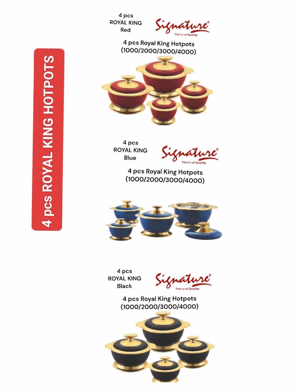 The Signature 4pc Royal King Hotpots are a stylish and practical solution for keeping food warm and fresh. Crafted with high-quality insulation, these hotpots retain heat for extended periods, ensuring your meals are served at the perfect temperature. Made from durable materials, they are built for long-lasting use and easy maintenance. The set includes four hotpots of varying sizes, making them ideal for different serving portions, whether for everyday meals or special occasions. With their elegant design, they add a touch of sophistication to your dining experience.