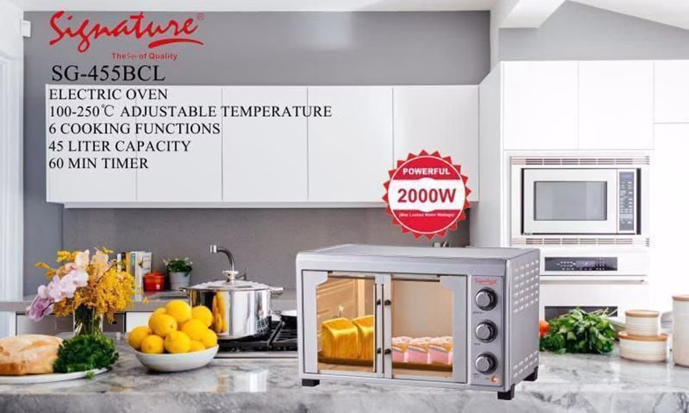 The Signature SG-455BCL 45L Electric Oven is a versatile and efficient kitchen appliance that offers a range of features to enhance your cooking experience. With a generous 45-liter capacity, it’s suitable for preparing a variety of dishes, whether you’re baking, roasting, or grilling. The oven is equipped with independent temperature knobs that allow you to control the top and bottom heating elements separately, providing flexibility and precision for different cooking requirements. Additionally, the 60-minute timer with an automatic shut-off signal ensures that your meals are cooked perfectly every time. The stainless steel door handle, frame, and panel not only add a touch of style and elegance to your kitchen but also ensure durability. For ease of maintenance, the oven includes a slide-out crumb and grease tray, making cleanup a breeze. This model is known for its energy efficiency and quality, making it a valuable addition to any home kitchen.