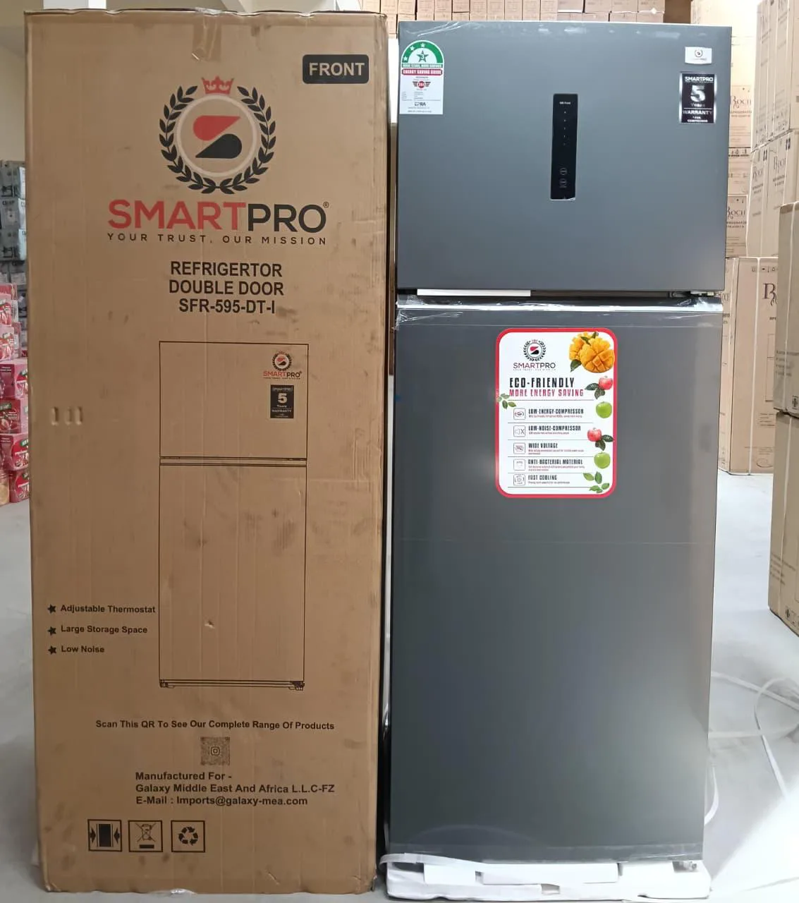Keep your food fresh and your kitchen stylish with the Smart Pro SFR595DT-I 464L Non-Frost Double Door Refrigerator. Designed with a spacious 464-liter capacity, this refrigerator offers ample room for both fresh and frozen items, making it perfect for large households or busy kitchens. Its advanced non-frost technology ensures consistent cooling without ice build-up, eliminating the hassle of manual defrosting while keeping food fresher for longer. The double door design provides easy access and organized storage, while adjustable shelves and door racks allow flexible arrangement to suit your needs. Energy-efficient and finished with a sleek modern look, the Smart Pro SFR595DT-I combines practicality, durability, and elegance—an ideal choice for families, restaurants, and event setups.