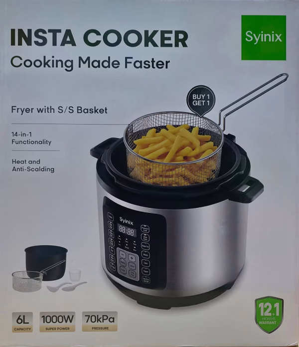Syinix 6L Electric Pressure Cooker, designed to deliver speed, versatility, and convenience in one sleek appliance. Featuring 14-in-1 functionality, this cooker handles everything from rice and soup to frying and slow cooking — making it a true all-rounder for busy kitchens. Its 1000W power output ensures fast and efficient meal preparation, while the extra-large 6L capacity is perfect for families or batch cooking. The unit includes a stainless steel frying basket, a non-stick inner pot, and a power-off memory function that resumes cooking after interruptions. Safety is built in with anti-scalding design, and cleanup is a breeze thanks to its easy-to-clean surfaces. Whether you’re preparing everyday meals or experimenting with new recipes, the Syinix pressure cooker offers smart, reliable performance with a touch of elegance.