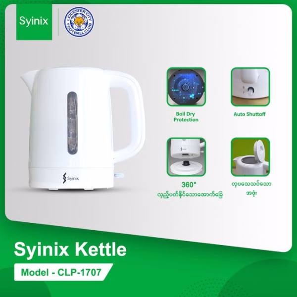 The Syinix CLP‑1707 1.7L Electric Kettle 🫖 is a modern, cordless kettle designed for convenience and safety in everyday use. With its 1.7‑litre capacity, it’s perfect for family or office settings, while the rapid boil technology ⚡ ensures hot water is ready in minutes. Built from food‑grade materials🎨, it blends style with durability. Safety features like auto shut‑off and boil‑dry protection 🔒 give peace of mind, and the wide lid plus removable filter make filling and cleaning effortless.