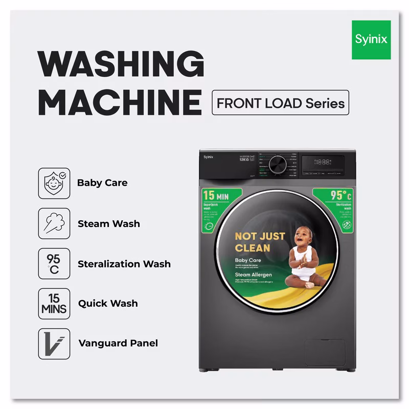 The Syinix V12WFT 12KG Wash & Spin Front-Load Automatic Washing Machine is a premium laundry solution built for large households that value efficiency and convenience. ๐งบโจ With its 12-kilogram capacity, it easily handles bulky loads such as duvets, curtains, and family laundry in one cycle. Featuring fully automatic wash and spin functions, it delivers powerful cleaning while saving time and energy. โก๐ฑ Advanced programs like Baby Care Steam Wash ensure hygienic cleaning for sensitive fabrics, while the 90ยฐC tub clean function keeps the drum fresh and free from bacteria. ๐๐ถ Its front-load design maximizes water and detergent efficiency, and the inverter motor provides quiet, durable, and energy-saving performance. Sleek in design with a modern grey finish, the Syinix V12WFT combines style, reliability, and advanced technology, making it the perfect choice for families seeking a high-capacity, hassle-free laundry experience. ๐ ๐
