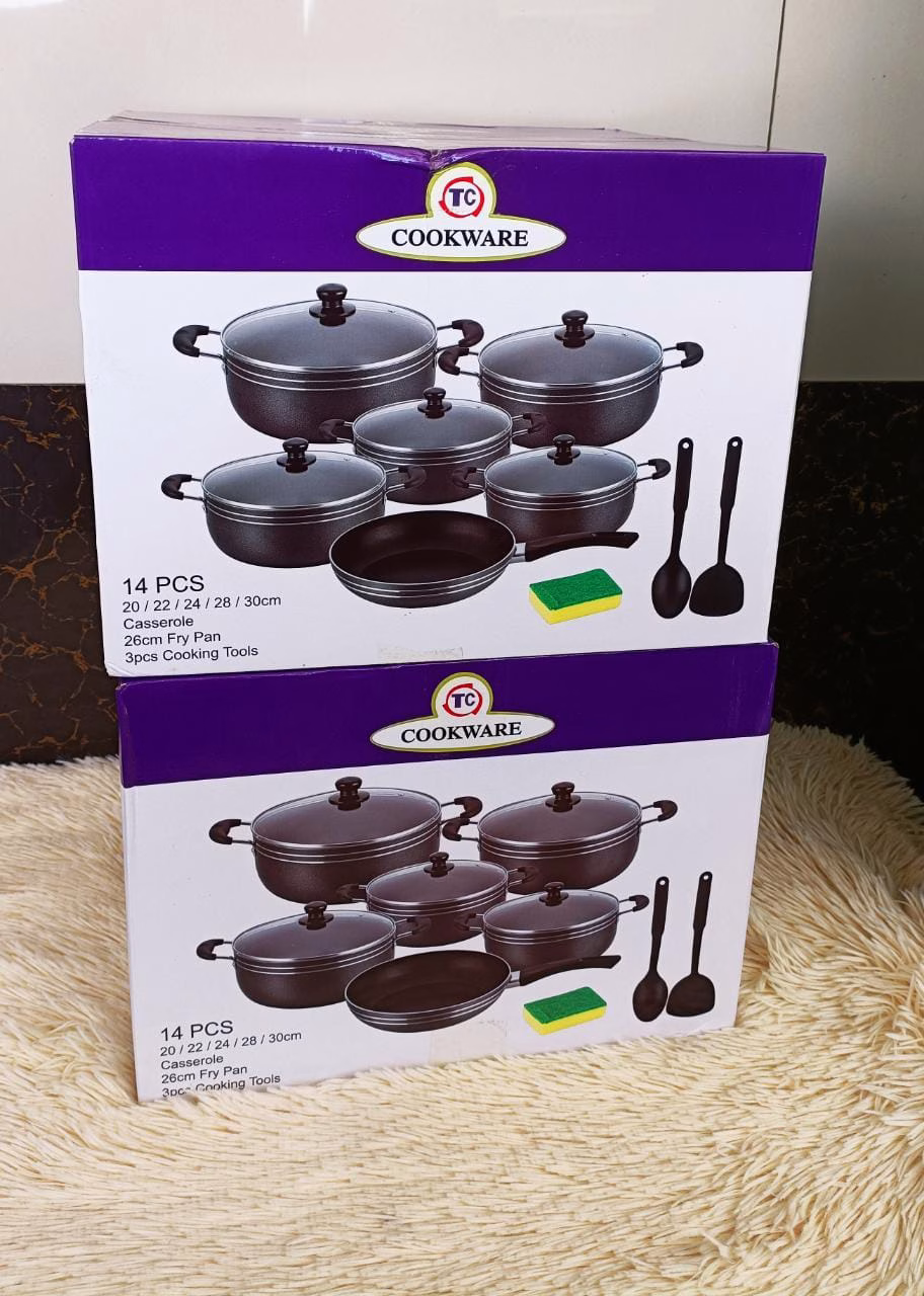 The TC 14pcs Non-Stick Cookware Set is a comprehensive and versatile collection designed to simplify your cooking experience. It features a superior non-stick coating that ensures effortless cooking and easy cleaning, allowing you to use minimal oil for healthier meals. The set includes five different-sized casseroles (20cm, 22cm, 24cm, 28cm, and 30cm) to cater to various cooking needs, along with a 26cm frying pan for perfect sautéing and frying. Each casserole comes with tempered glass lids, enabling you to monitor your food without releasing heat. Additionally, the set includes bonus utensils like non-stick spoons and a Scotch Brite for cleaning convenience. Crafted from durable materials, these pots and pans ensure even heat distribution for consistent cooking results. With its elegant design and practical features, this cookware set is ideal for both home cooks and kitchen enthusiasts.